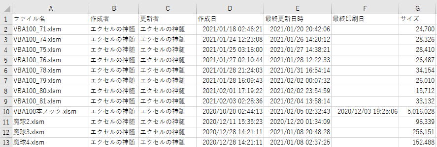 ws.Cells(i, 4).Value = wb.BuiltinDocumentProperties("Creation date") '作成日時